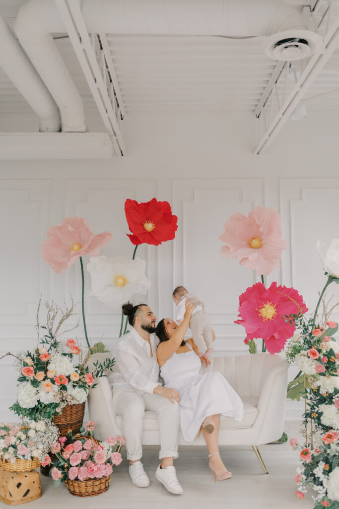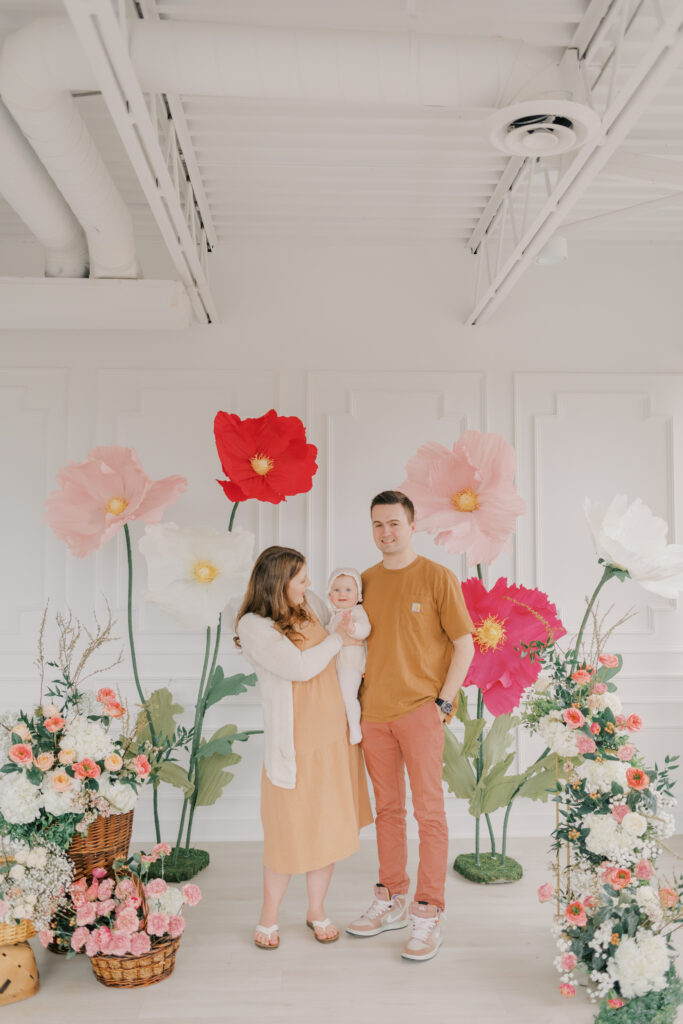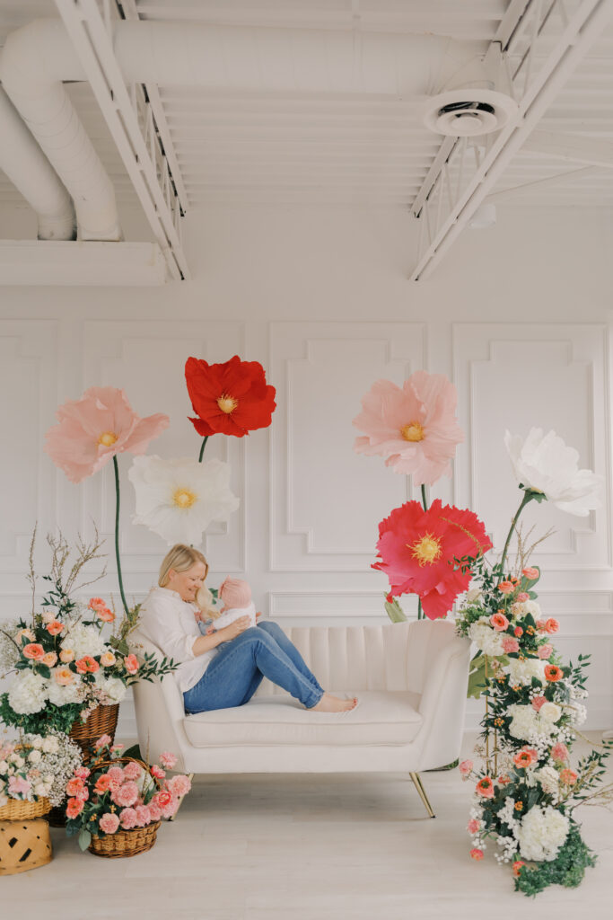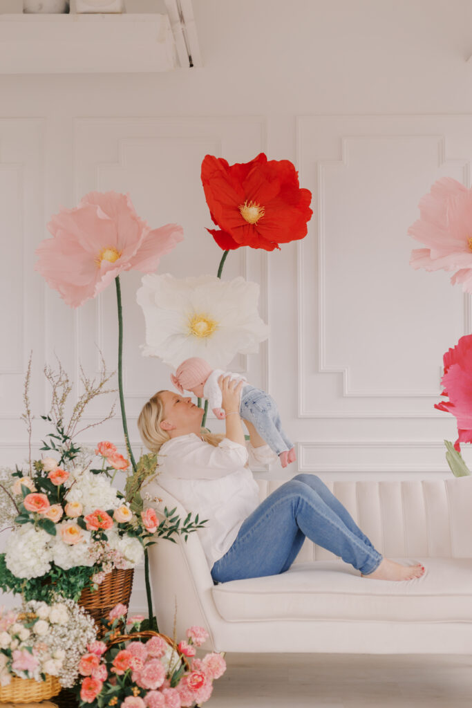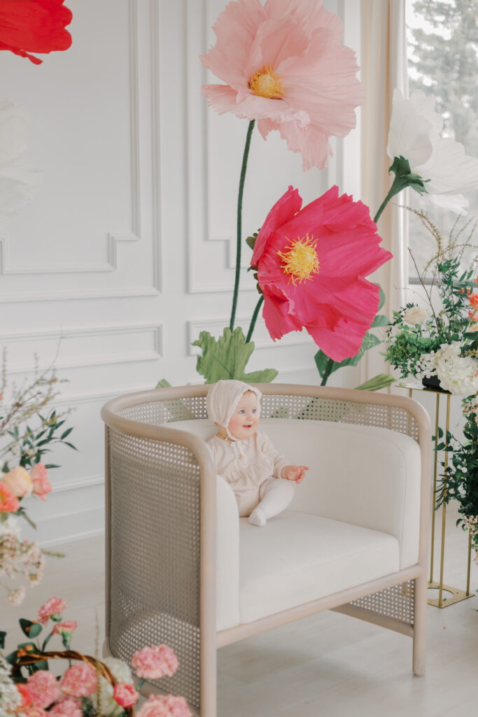 I designed and built five to six large-scale paper flowers to frame the seating area, creating a space that felt playful yet refined. Hosting these sessions indoors was a very intentional choice. April weather in Ottawa can still feel wintery, and I wanted families to arrive knowing they would be warm, comfortable, and surrounded by natural light.