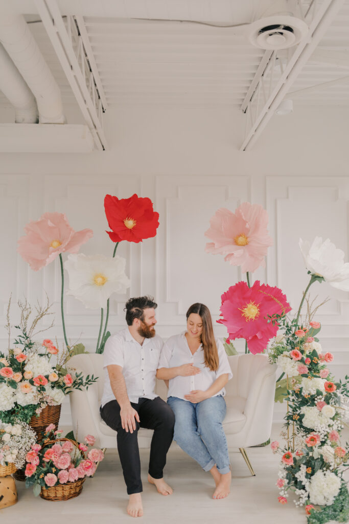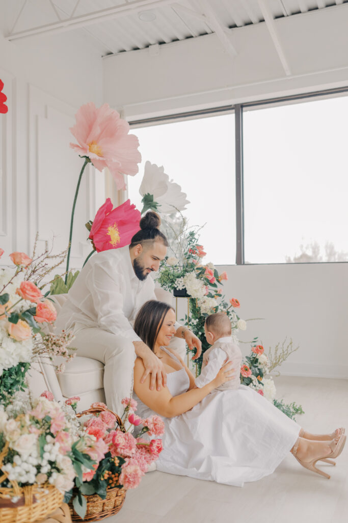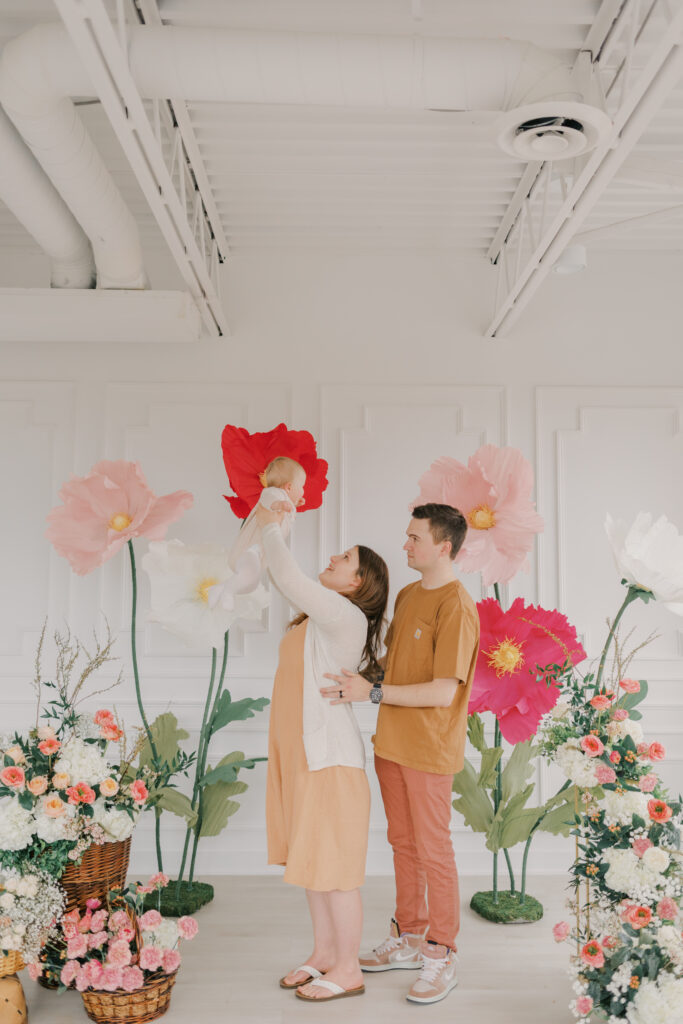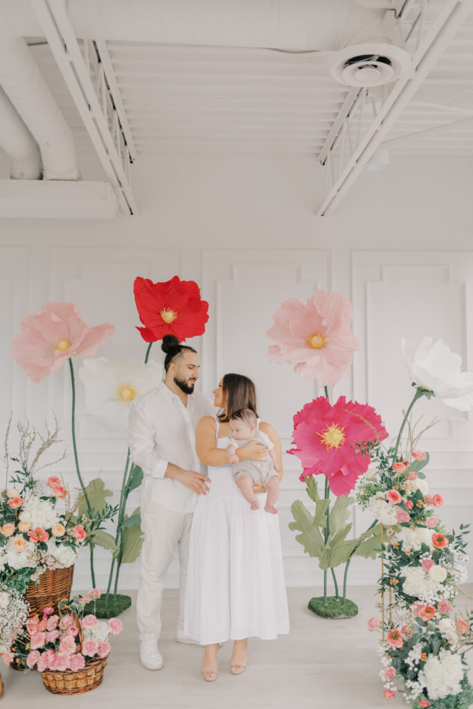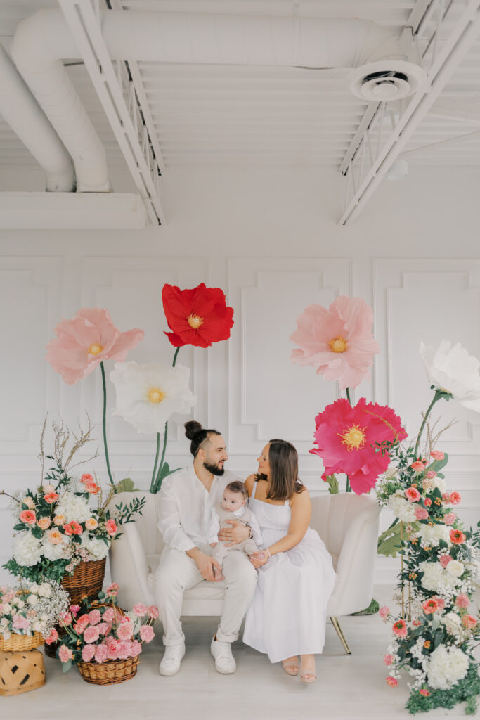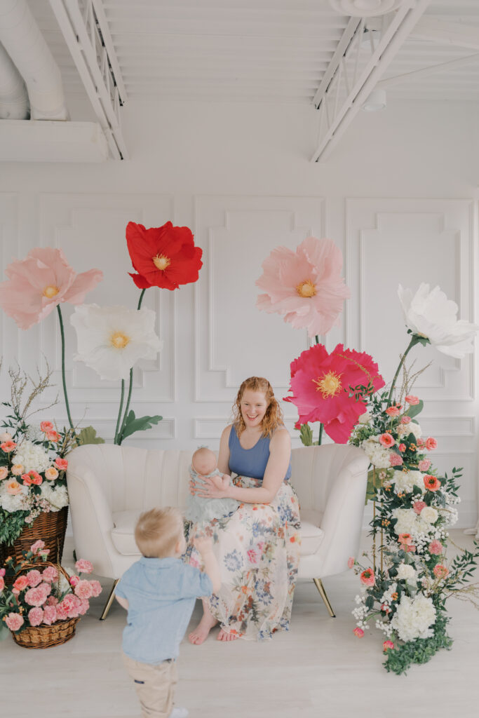 I designed and built five to six large-scale paper flowers to frame the seating area, creating a space that felt playful yet refined. Hosting these sessions indoors was a very intentional choice. April weather in Ottawa can still feel wintery, and I wanted families to arrive knowing they would be warm, comfortable, and surrounded by natural light.